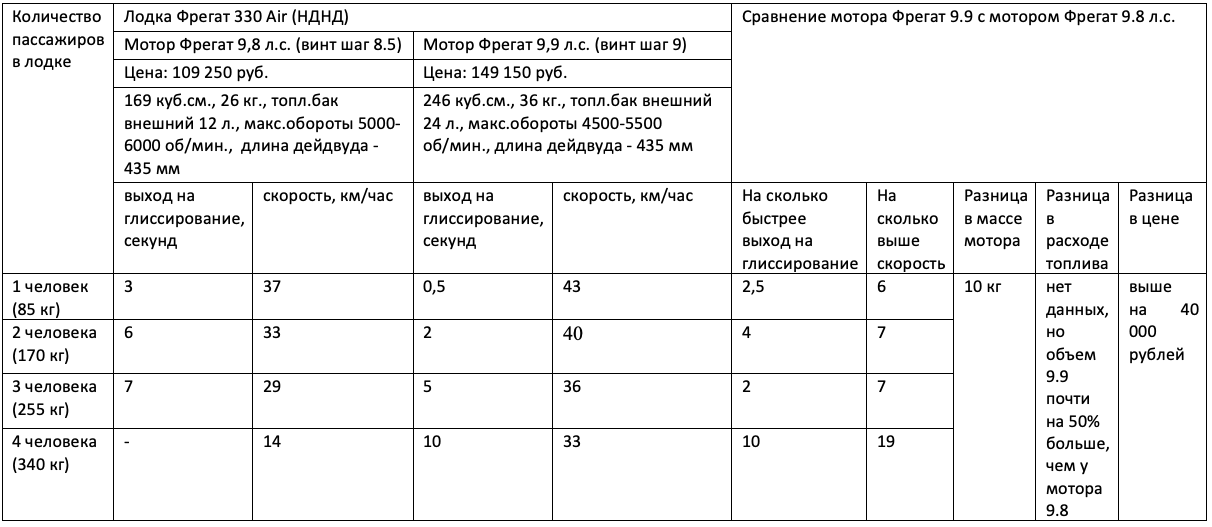 Из таблицы видно, что при разных загрузках Фрегат 9.9 в среднем имеет скорость на 6-7 км/ч больше, чем Фрегат 9.8. Существенная разница в скорости и выходе на глиссирование наблюдается только при загрузке 4-х человек.